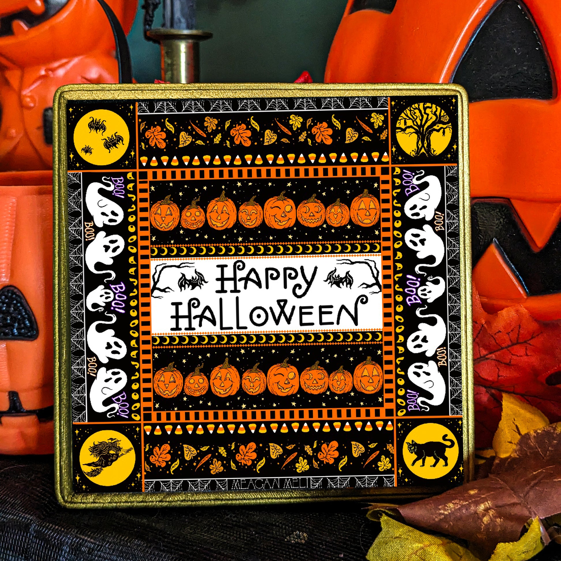 This is a giclee print mounted on a painted gold birch wood panel measuring 6" x 6". The print is archival, and mounted with archival glue. Back of the panel features a sawtooth hanger, ready for you to hang in your haunted home!