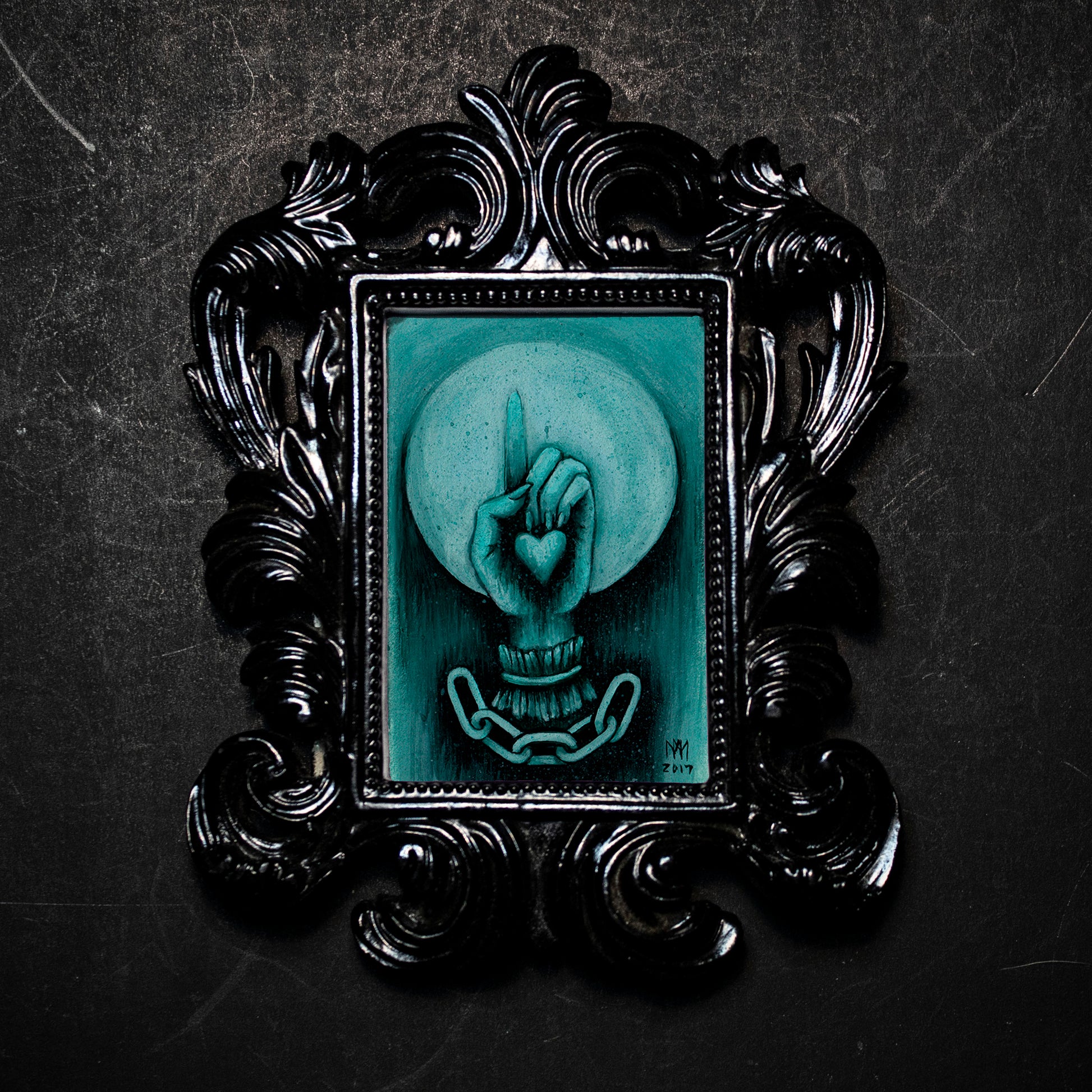 This small giclee print measuring 1.75” x 2.5” is encased in a 3.5” x 4.5” resin frame painted black. The back of the frame features a brass loop for safe hanging, and is lined with velvet. This frame does NOT have glass or plastic protecting the print. Giclee prints are the closest reproduction that looks like the original work. Please refer to the scan of the artwork for closest color representation, photos of the product aren't always true to color.