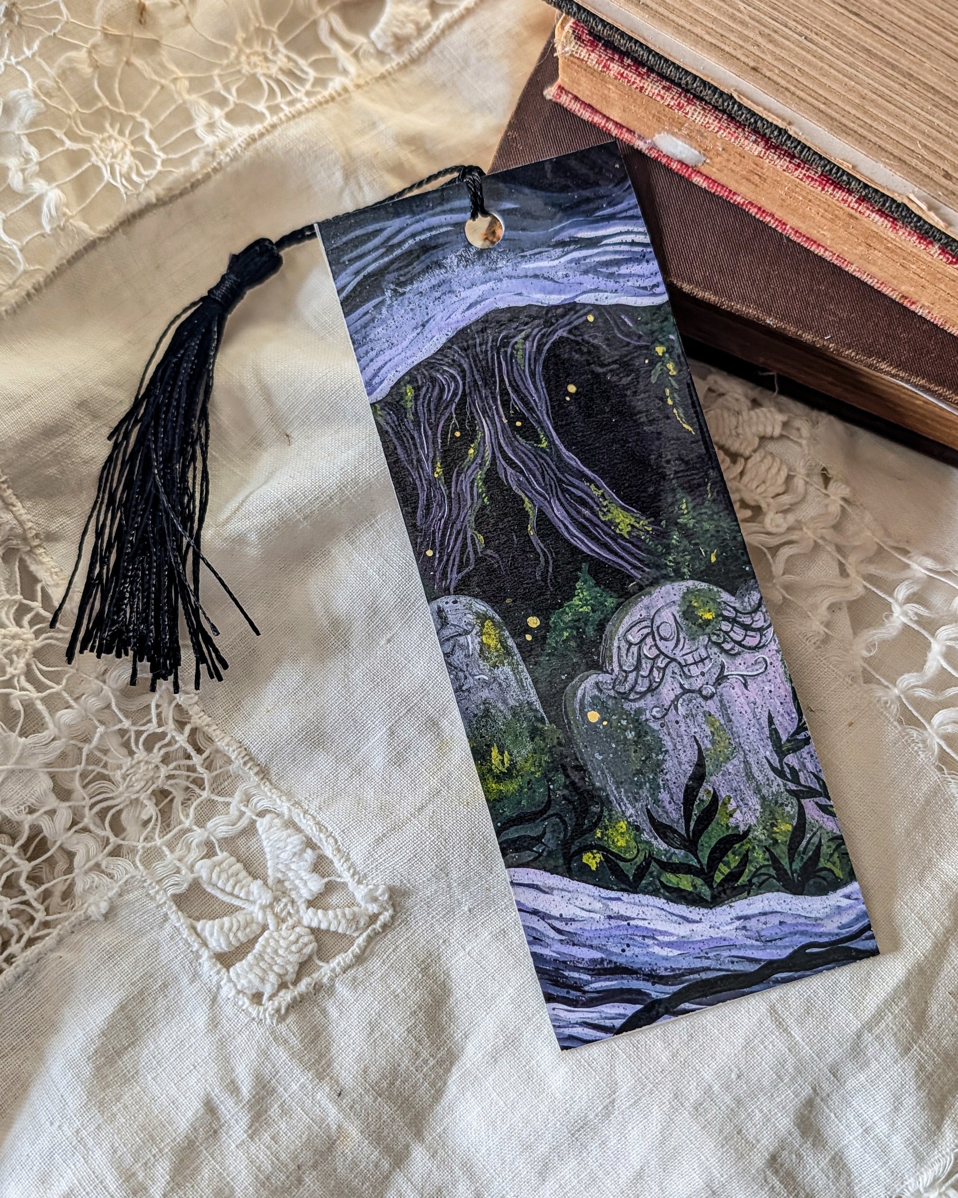 Choose one, or all five of these bookmarks depicting my favorite painting, At The End of the Forest! These bookmarks are crafted from upcycled misprints from my studio. These double sided bookmarks measure 2” x 5.5”. The glossy finish and charming tassel make it easy to keep your place, making them an essential piece for every book lover.