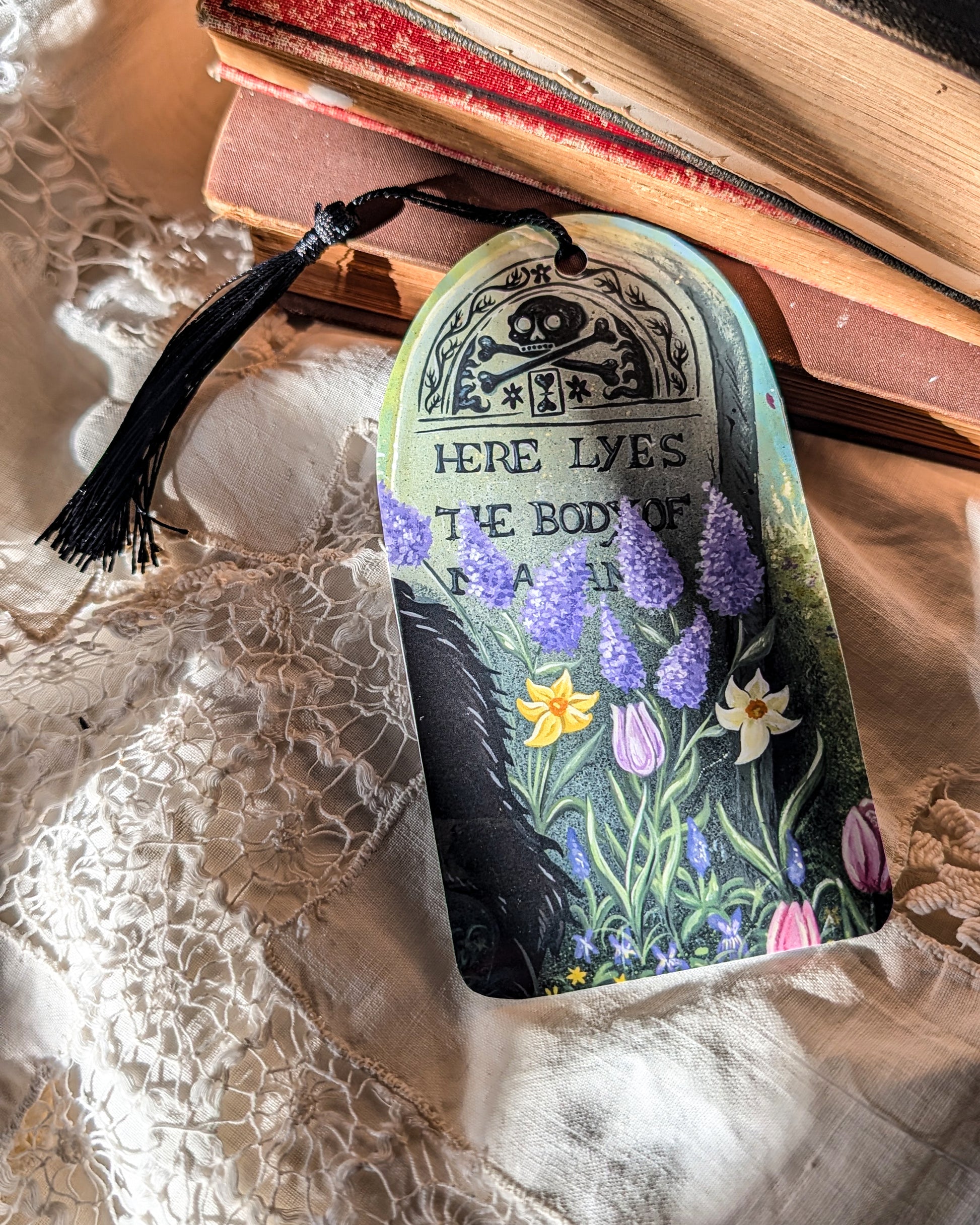 Spring flowers, black cats, and cemetery strolls are some of my favorite things! How about you? These bookmarks are crafted from upcycled misprints from my studio. This double sided bookmark measures 3” x 5”. The glossy finish and charming tassel make it easy to keep your place.