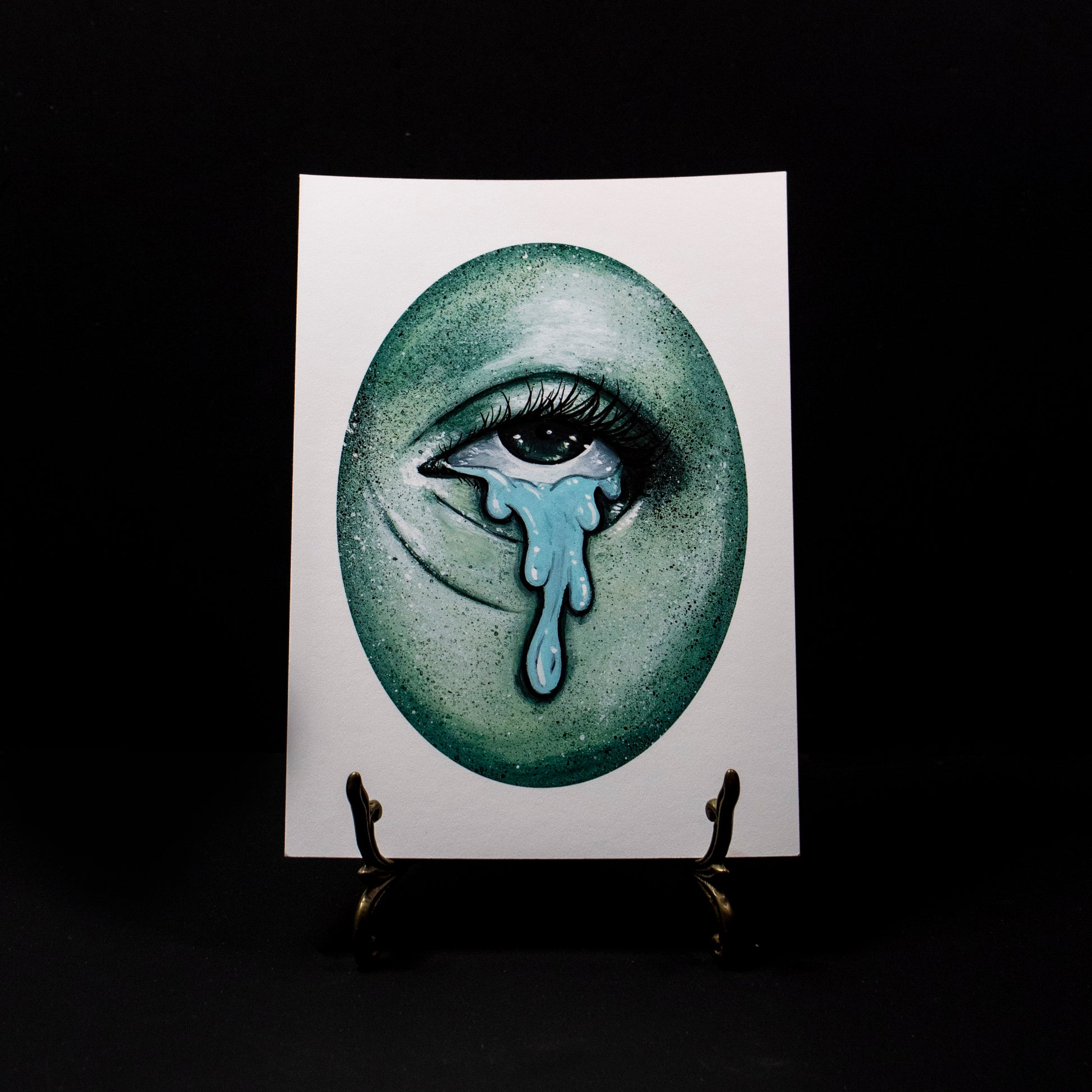 This is a giclee print, giclee prints are high quality fine-art prints that are archival. This Ghostly Eye print measures 5" x 7", and is printed on MOAB Bright paper. Giclee prints are the closest reproduction that looks like the original work. Please refer to the scan of the artwork for closest color representation, photos of the product aren't always true to color.