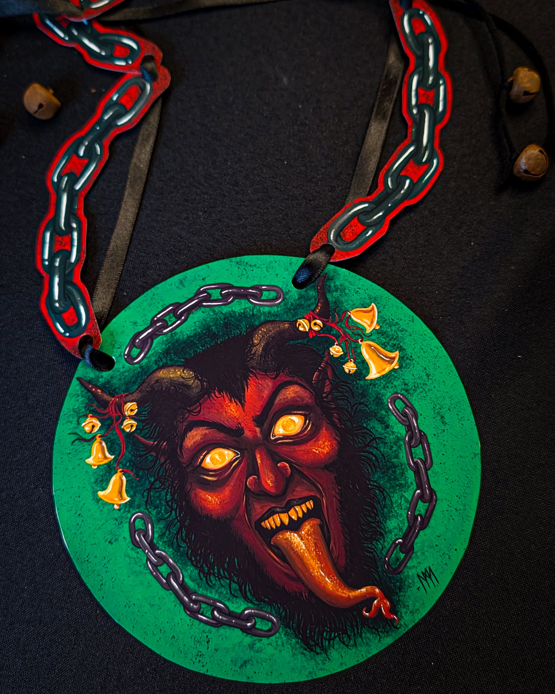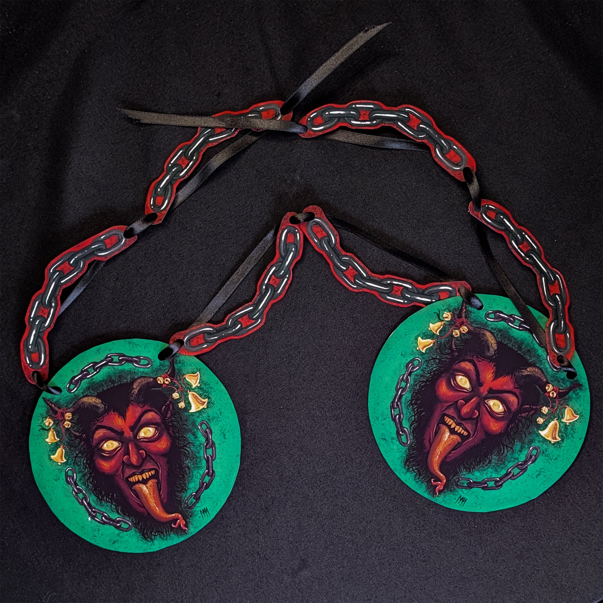 Greet your family this Krampusnacht with a Krampus decoration! Inspired by vintage holiday décor, this garland measures 4ft long, strung on black satin ribbon and features: