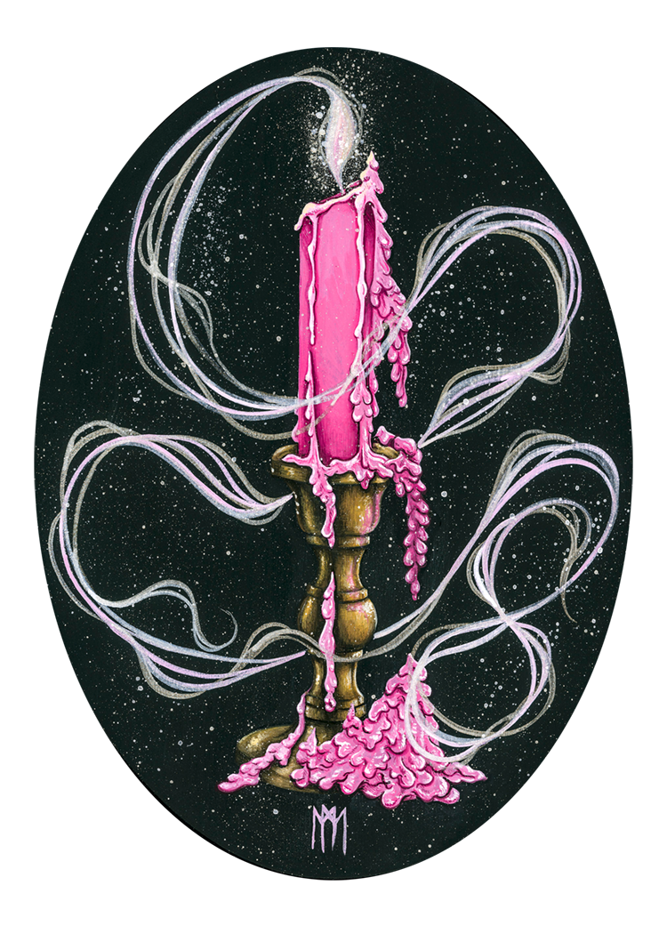 The color pink has been weighing on my mind, and with this painting I wanted to channel my relationship with the color when it comes to candle magick. Pink is a divine, happy color. Many associate the pink candle with love, affection, sensuality. For me, it's not just that - but a feeling of healing myself through my femininity. The feeling of acceptance and compassion also comes through with the color pink.
