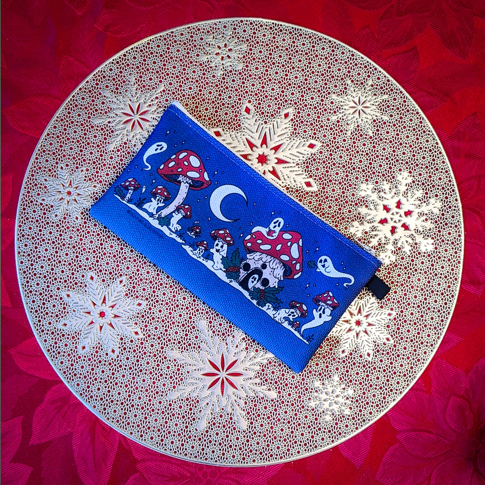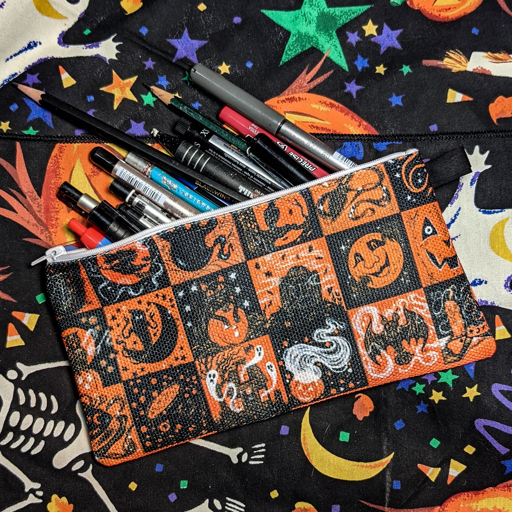 Measuring a lovely 9” x 4”, this pencil case can hold all of your needs! It can be used as a wallet, pencil case, make up bag, or just a clutch for on the go! Printed on 100% polyester textured canvas, it withstands daily use. Featuring a YKK zipper, and a fabric loop on the side perfectly fit for a carabiner or keychain - this case is incredibly functional. Pictured is another product photo, made in the same style as this will be.