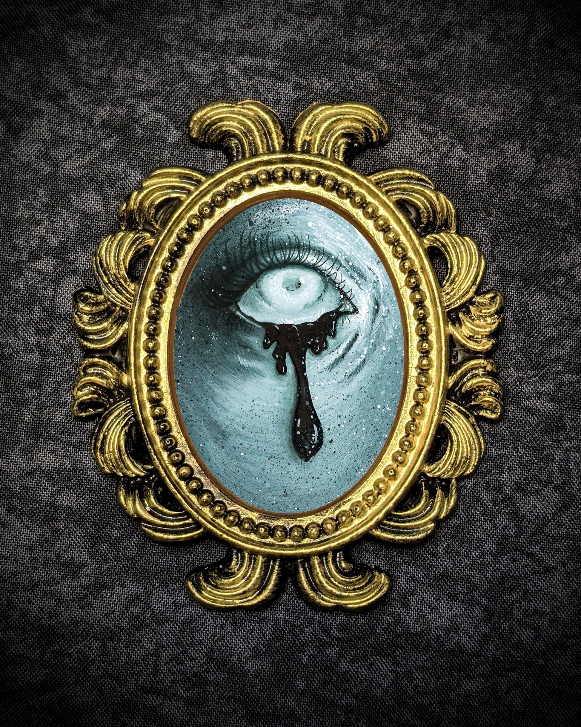 This small giclee print measuring 2” x 3” is encased in a 3” x 4” resin frame painted black. The back of the frame features a brass loop for safe hanging, and is lined with velvet. This frame does NOT have glass or plastic protecting the print. Please choose from a black or gold distressed frame!