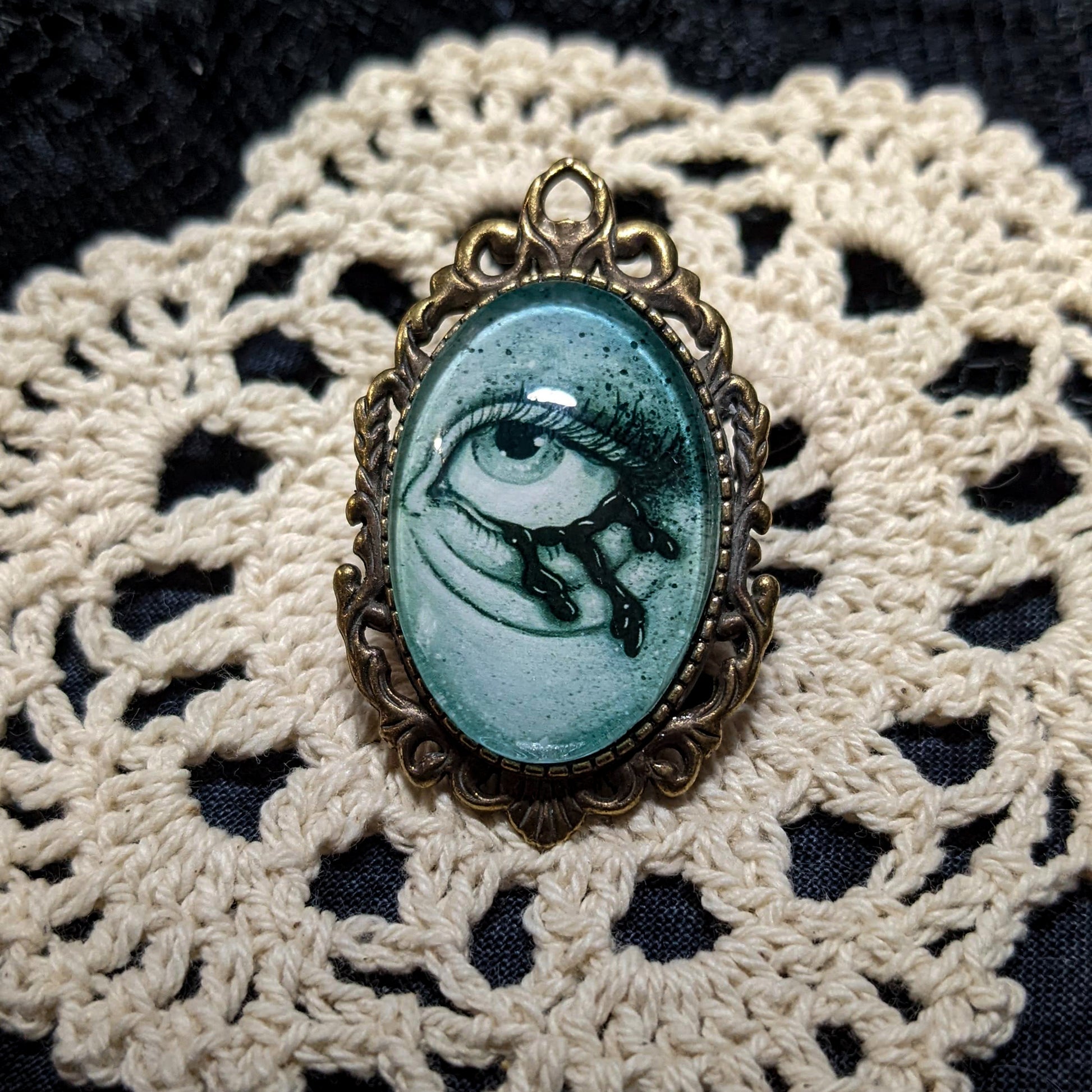 Lover’s Eyes once were tiny personal portraits gifted to missed partners while on a journey in the 19th century. Originating in the Georgian period, these were commonly made. As time went on they became items worn by those in mourning, not only of lovers, but of family members. I created the ghostly eyes so they can be worn by anyone to represent those they miss, or mourn those that have been lost.